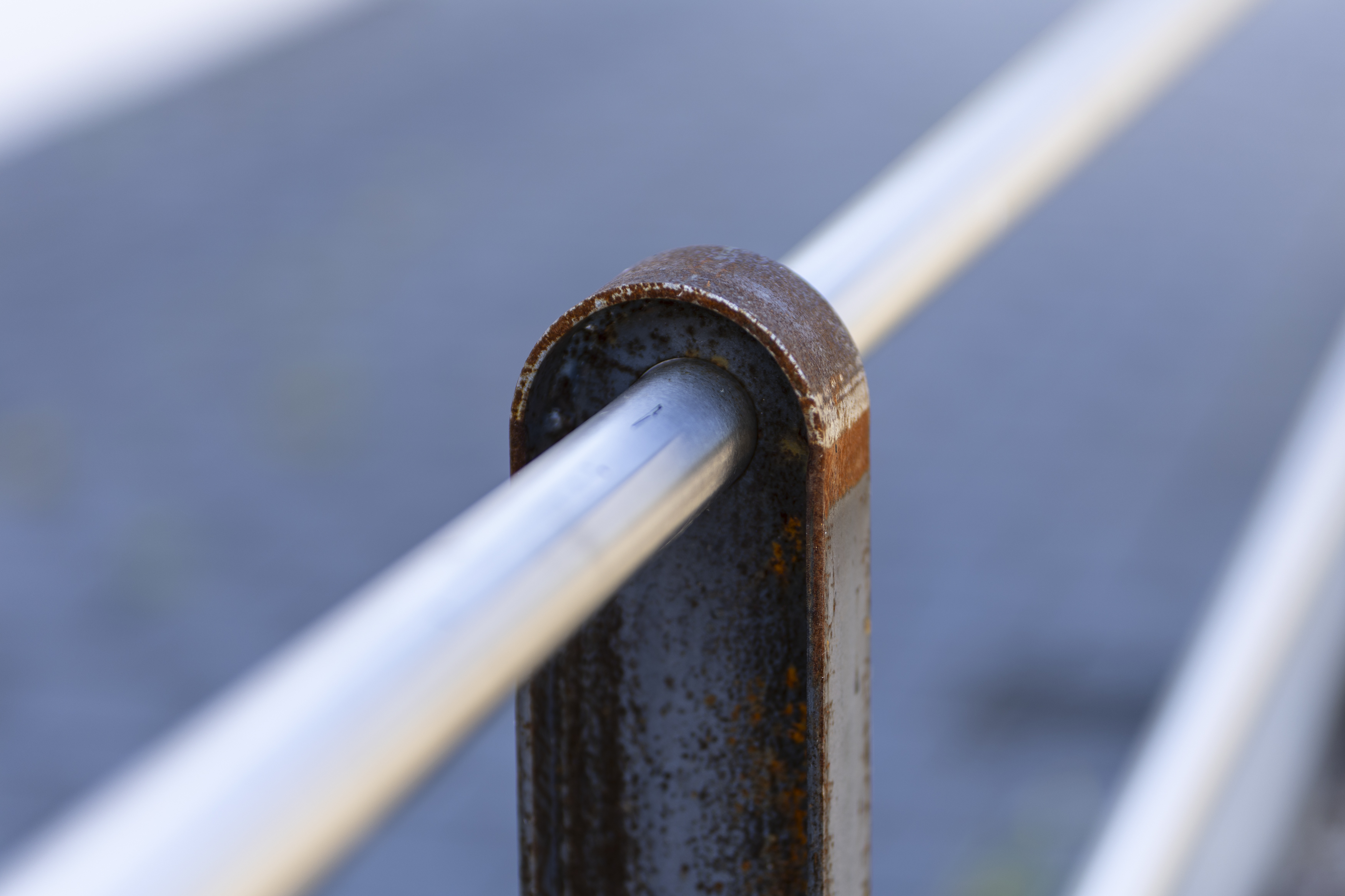 Das Geländer sichert zuverlässig vor Abstürzen. Die Optik passt sich optimal in das umliegende Gewerbegebiet ein. Das Material lebt und verändert sich mit der Zeit – es entsteht der Charakter von Cortenstahl. Die Edelstahlrohre behalten ihr Erscheinungsbild.