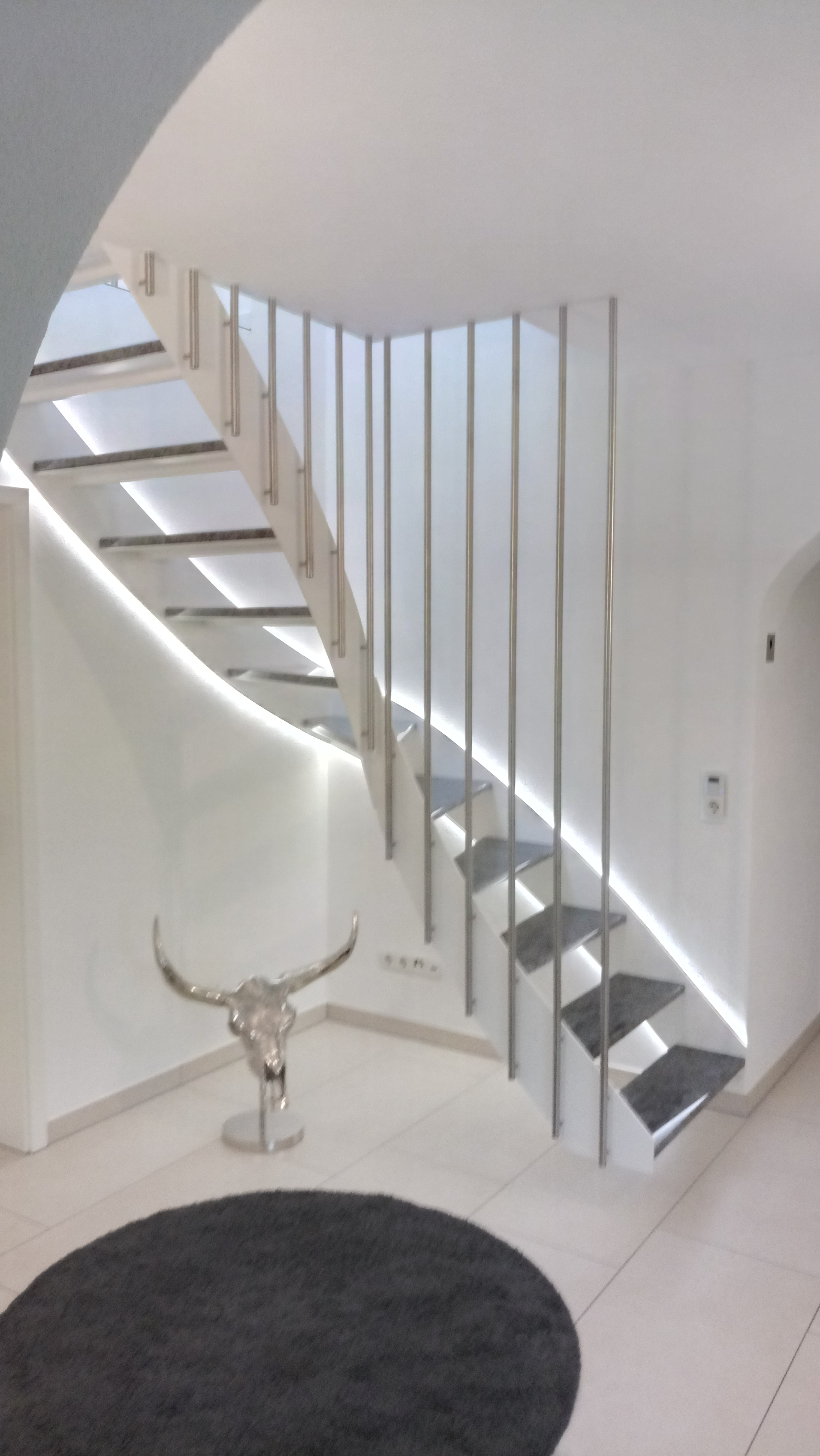 Die Innentreppe dient als sichere und platzsparende Lösung. Das Harfengeländer lässt den Treppenaufgang luftig leicht wirken. Unterstrichen wir das moderne Design durch die indirekte LED-Beleuchtung in der Schattenfuge.