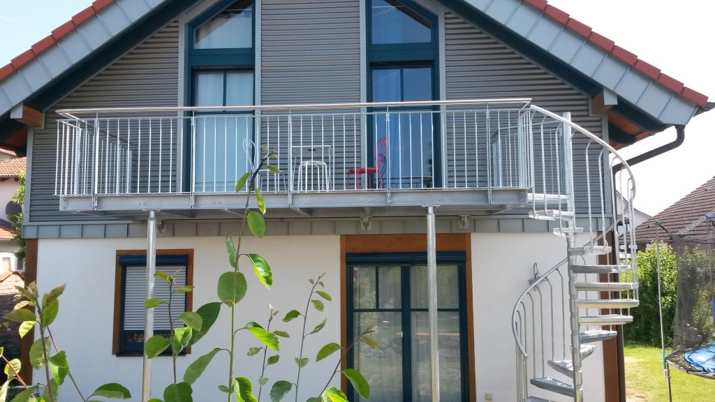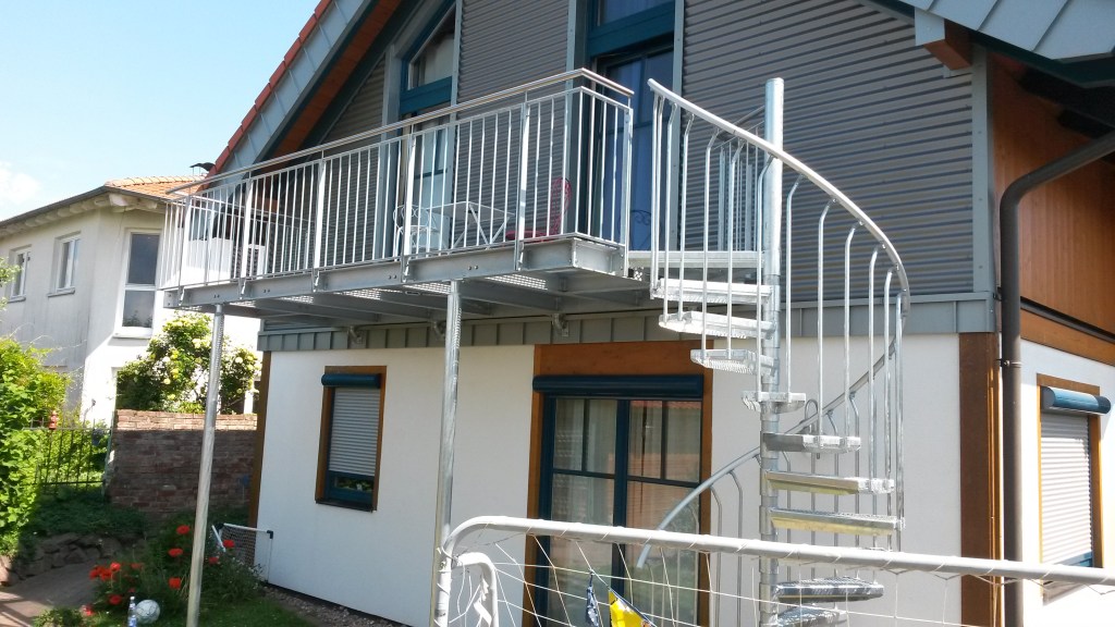 - Montage: Fundamente bauseits, Balkonkonstruktion und Geländer verschraubt, Handlauf vor Ort aufgeschweißt, Aufbau der Systemtreppe