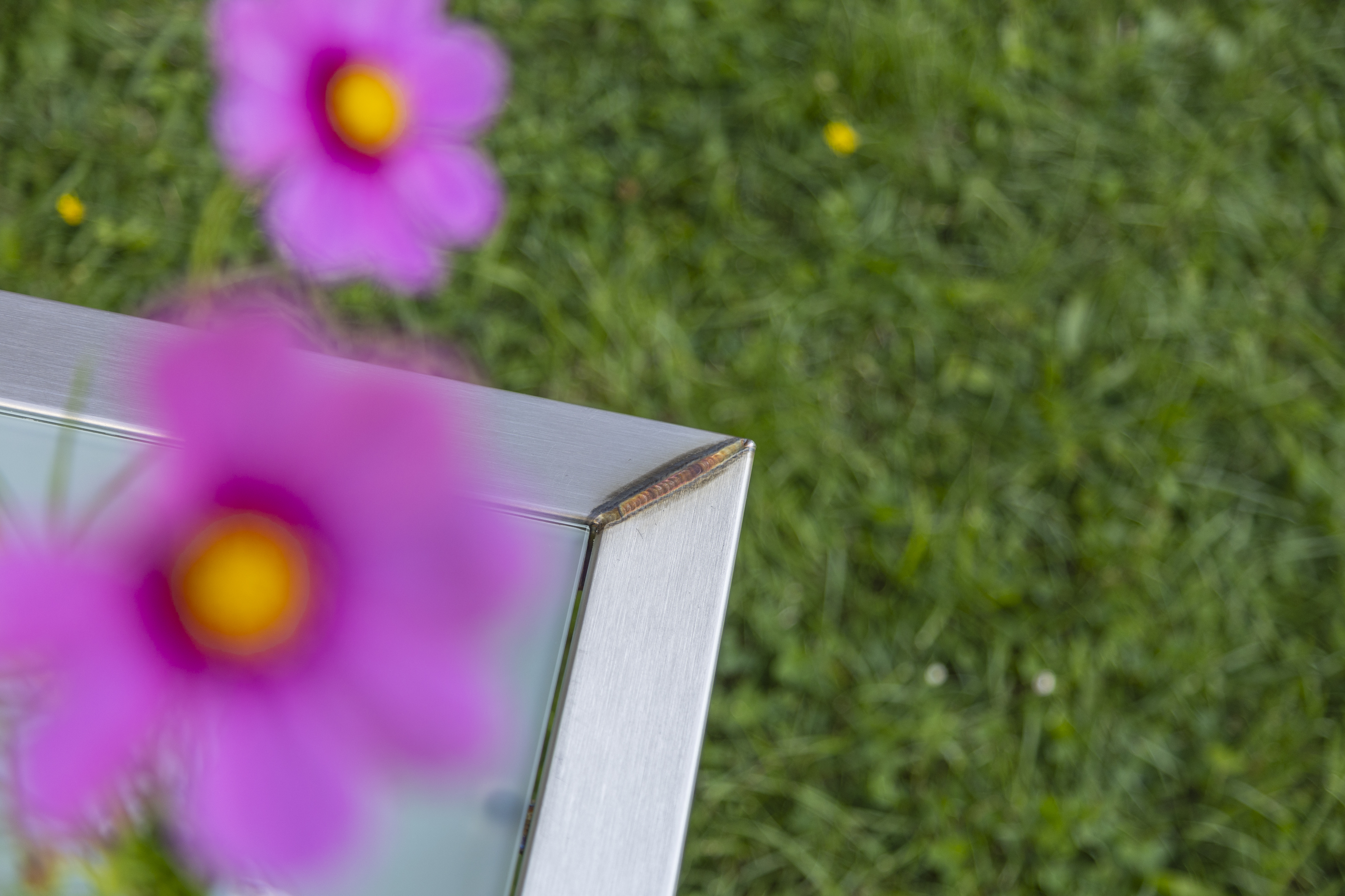 Der Tisch fügt sich dezent in den modern gestalteten Garten ein und bietet Platz für die ganze Familie. Als besonderes Designelement dienen die unbehandelten Schweißnähte und verleihen dem Tisch einen unvergleichlichen Look.