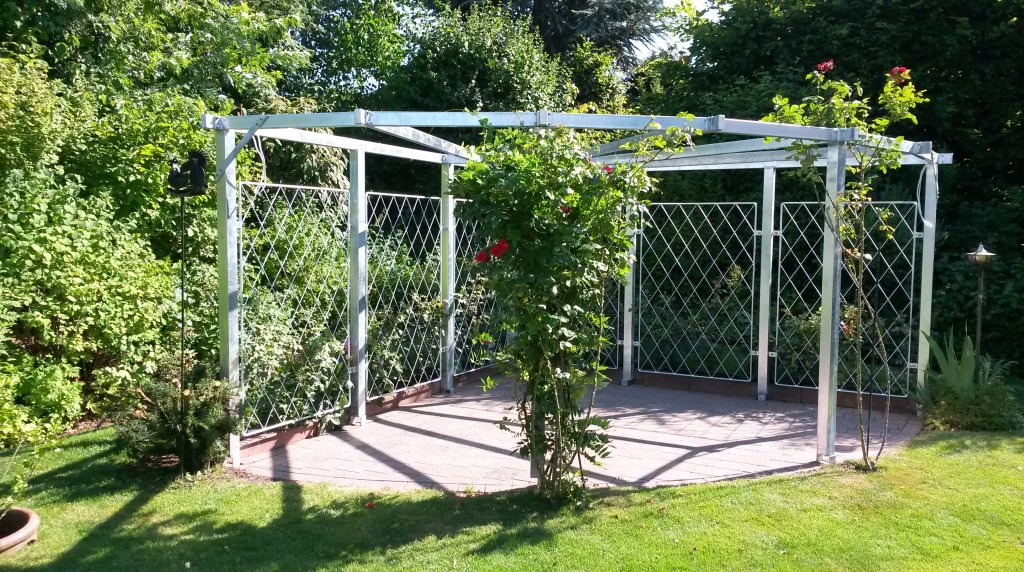 - Gitter-, Stab- oder Drahtelemente als Rankhilfe, die durch Bewuchs Schatten spenden und Sichtschutz bieten