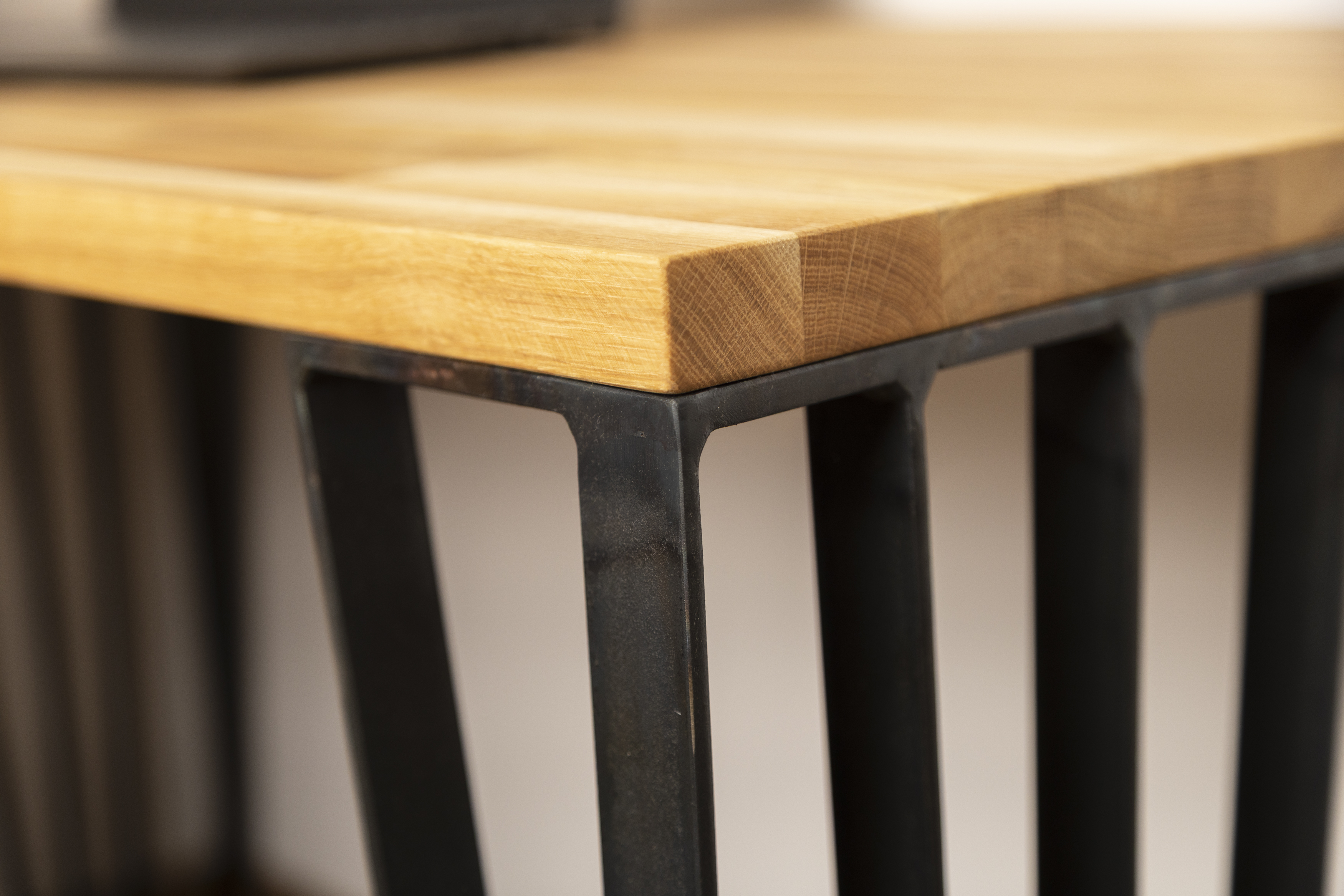Roher Stahl und Massivholz verschmelzen zu einer funktionellen Einheit. Die besondere Anordnung der Streben sorgt für eine lebendige Optik. Die metallene Abschlusskante schützt die Wand optimal vor Flecken durch Stöße von Ordnern, Büchern und sonstigen Arbeitsmaterialien.